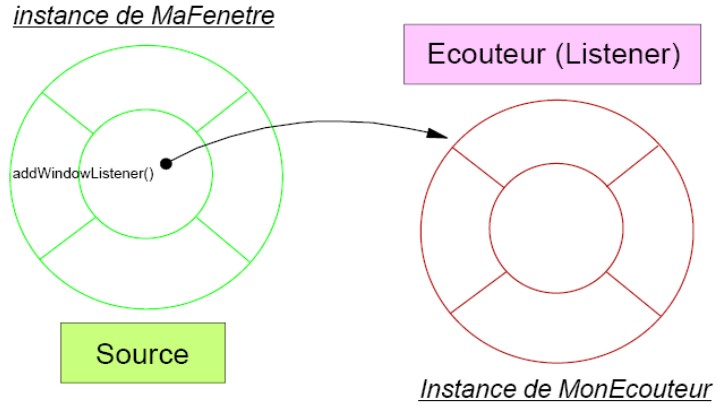 public class MonEcouteur extends WindowAdapter { MaFenetre maReferenceDeFenetre; public MonEcouteur(MaFenetre fen) { maReferenceDeFenetre = fen; } public void windowClosing(WindowEvent we) { // ici on appelle une méthode accessible via l'adresse de l'objet MaFenetre : maReferenceDeFenetre.traitementFinal(); } } **Utiliser une classe interne :** Il y a une autre solution dans la gestion des événements. Elle consiste à définir le listener dans une classe interne, comme ci-dessous : ```java addWindowListener ( new WindowAdapter() // début de la classe locale { public void windowClosing(WindowEvent we) { finTraitement(); } } // fin de la classe locale ); // fin du addWindowListener()