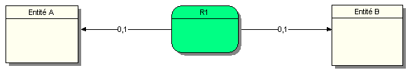 Une occurrence de l’entité A peut ne pas être associé ou être associé au maximum à une occurrence de l’entité B. Une occurrence de l’entité B peut ne pas être associé ou être associé au maximum à une occurrence de l’entité A.