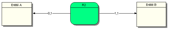Une occurrence de l’entité A peut ne pas être associée ou être associée au maximum à une occurrence de la relation R2. Une occurrence de l’entité B est associée à une et une seule occurrence de la relation R2. Cette formulation est quelque peu différente de celle du paragraphe 1 mais revient au même. Cette formulation est légitime puisqu’on parle d’occurrences de la relation R2. La première formulation que nous utilisons souvent s’avère plus facile à comprendre.