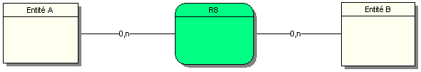 Une occurrence de l’entité A est associée à aucune ou plusieurs occurrences de la relation R8. Une occurrence de l’entité B est associée à aucune ou plusieurs occurrences de la relation R8.