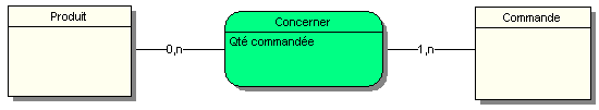 Dans cet exemple, un Produit peut être concerné par aucune ou plusieurs commandes, une Commande concerne au minimum un produit, voire plusieurs produits. En effet, pouvons-nous avoir une commande ne concernant aucun produit Pour que l’entité commande ait du sens il lui faut au moins une association avec un produit.