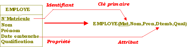 Toute entité est transformée en table. Ses propriétés deviennent les attributs de la table. L’identifiant devient clé primaire de la table.