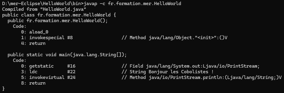 En écrivant ceci dans notre terminal javap -c fr.formation.mer.HelloWorld nous avons ceci comme résultat :