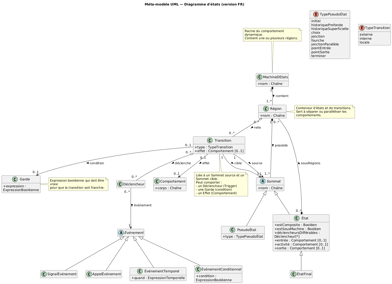 @startuml ' ============================================================ ' Méta-modèle UML — Diagramme d'États (version française) ' ============================================================ hide empty methods hide empty fields skinparam classAttributeIconSize 0 skinparam wrapWidth 240 skinparam maxMessageSize 120 title Méta-modèle UML — Diagramme d'états (version FR) ' ====================== ' Éléments principaux ' ====================== class MachineDEtats { + nom : Chaîne } class Région { + nom : Chaîne } abstract class Sommet { + nom : Chaîne } class État { + estComposite : Booléen + estSousMachine : Booléen + déclencheursDifférables : Déclencheur[*] + entrée : Comportement [0..1] + activité : Comportement [0..1] + sortie : Comportement [0..1] } class ÉtatFinal class PseudoÉtat { + type : TypePseudoÉtat } enum TypePseudoÉtat { initial historiqueProfonde historiqueSuperficielle choix jonction fourche jonctionParallèle pointEntrée pointSortie terminer } class Transition { + type : TypeTransition + effet : Comportement [0..1] } enum TypeTransition { externe interne locale } class Déclencheur abstract class Événement class SignalÉvénement class AppelÉvénement class ÉvénementTemporel { + quand : ExpressionTemporelle } class ÉvénementConditionnel { + condition : ExpressionBooléenne } class Garde { + expression : ExpressionBooléenne } class Comportement { + corps : Chaîne } ' ====================== ' Relations hiérarchiques ' ====================== Sommet <|-- État Sommet <|-- PseudoÉtat État <|-- ÉtatFinal Événement <|-- SignalÉvénement Événement <|-- AppelÉvénement Événement <|-- ÉvénementTemporel Événement <|-- ÉvénementConditionnel MachineDEtats "1" *-- "1..*" Région : contient > Région "1" *-- "1..*" Sommet : possède > Région "0..*" o-- "0..*" Transition : relie > Transition "1" --> "1" Sommet : source > Transition "1" --> "1" Sommet : cible > Transition "0..1" --> "0..1" Garde : condition > Transition "0..*" o-- "0..*" Déclencheur : déclenche > Déclencheur "0..*" --> "1" Événement : événement > Transition "0..1" --> "0..1" Comportement : effet > État "0..*" *-- "0..*" Région : sousRégions > ' ====================== ' Notes pédagogiques ' ====================== note top of MachineDEtats Racine du comportement dynamique. Contient une ou plusieurs régions. end note note right of Région Conteneur d'états et de transitions. Sert à séparer ou paralléliser les comportements. end note note bottom of Transition Liée à un Sommet source et un Sommet cible. Peut comporter : - un Déclencheur (Trigger) - une Garde (condition) - un Effet (Comportement) end note note right of Garde Expression booléenne qui doit être vraie pour que la transition soit franchie. end note @enduml