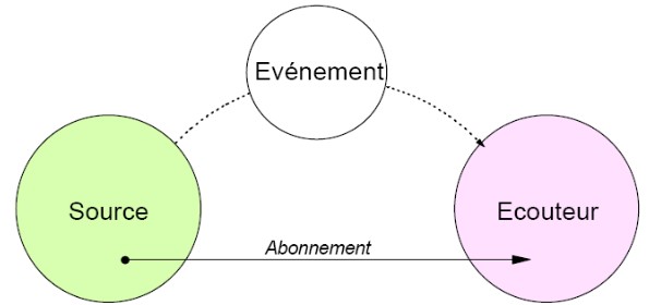 On peut dire aussi que le listener s’enregistre auprès de la source de l’événement.