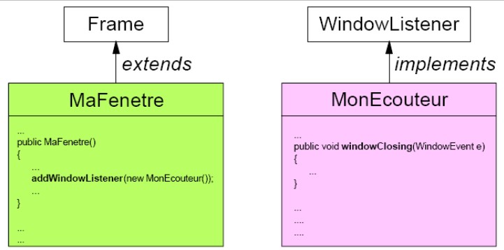 public class MonEcouteur extends WindowAdapter { MaFenetre maReferenceDeFenetre; public MonEcouteur(MaFenetre fen) { maReferenceDeFenetre = fen; } public void windowClosing(WindowEvent we) { // ici on appelle une méthode accessible via l'adresse de l'objet MaFenetre : maReferenceDeFenetre.traitementFinal(); } } **Utiliser une classe interne :** Il y a une autre solution dans la gestion des événements. Elle consiste à définir le listener dans une classe interne, comme ci-dessous : ```java addWindowListener ( new WindowAdapter() // début de la classe locale { public void windowClosing(WindowEvent we) { finTraitement(); } } // fin de la classe locale ); // fin du addWindowListener()