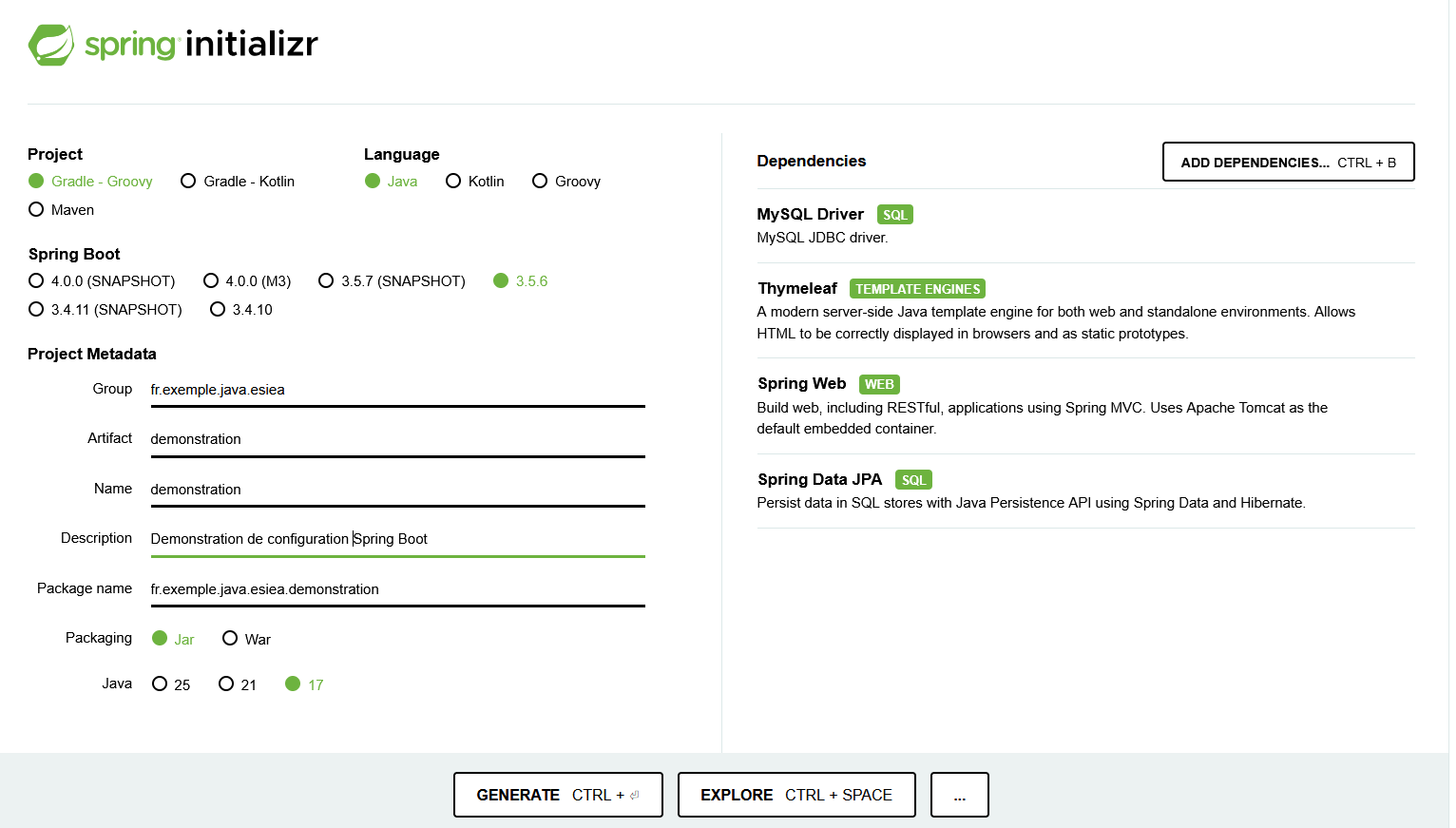 SPRING INITIALIZR ├── Project : Maven / Gradle ├── Language : Java / Kotlin / Groovy ├── Spring Boot Version ├── Project Metadata │ ├── Group │ ├── Artifact │ ├── Name │ ├── Description │ ├── Package name │ ├── Packaging │ └── Java Version ├── Dependencies └── Buttons (Generate / Explore)