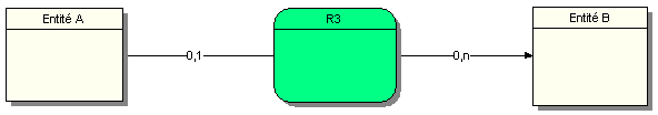 Une occurrence de l’entité A peut ne pas être associée ou être associée au maximum à une occurrence de la relation R2. Une occurrence de l’entité B est associée à une et une seule occurrence de la relation R2. Cette formulation est quelque peu différente de celle du paragraphe 1 mais revient au même. Cette formulation est légitime puisqu’on parle d’occurrences de la relation R2. La première formulation que nous utilisons souvent s’avère plus facile à comprendre.