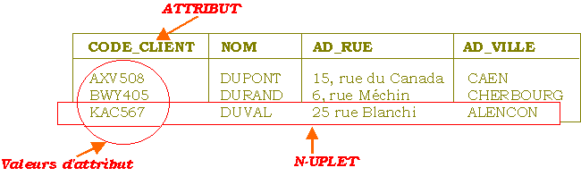 La table (ou relation) se définie comme un tableau de données. Les colonnes sont les attributs et les lignes sont des tuples (enregistrements). une RELATION ou TABLE est le résultat d’une opération sur les ensembles constitués par les valeurs des attributs.