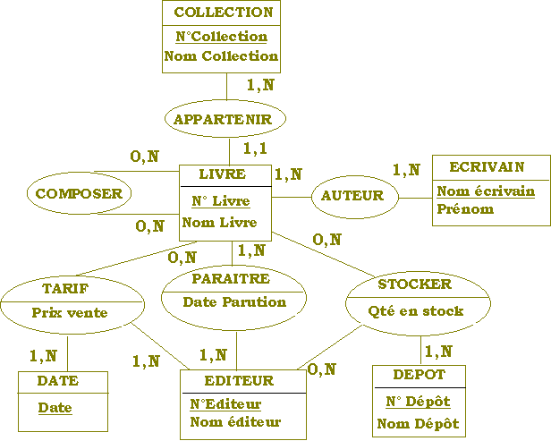 COLLECTION (Ncoll, NomColl) LIVRE (Nlivre, Nomlivre,#Numcoll) COMPOSER (#Nliv1,#Nliv2) AUTEUR (#Nolivre,#NomEcri) ECRIVAIN (NmEcriv,PrnomEcriv) TARIF (#Nlivr, #Nedit, #Date, Prix) PARAITRE (#NoLvre, #NoEdit, DatPar) STOCKER (#Nolivre, #Ndepot, #Nedit, Qte) ÉDITEUR (NoEdit, NomEdit) DÉPOT (NoDep, NomDep)
